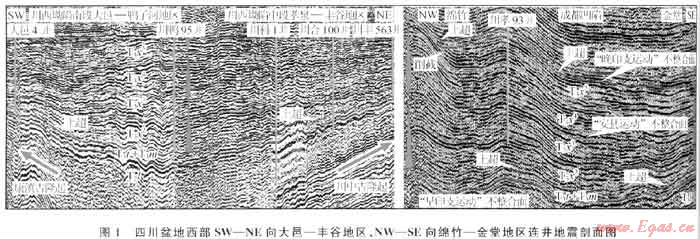 基準(zhǔn)面上升旋回內(nèi)巖相存在明顯差異,即等時(shí)異相,川西坳陷中段成都凹陷NW-SE向諸多三維地震剖面這一特征非常典型,受篇幅所限,此不贅述。