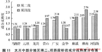 川中地區(qū)須家河組各砂層段厚度基本一致,砂巖百分比較高,一般介于70%~90%。經(jīng)巖礦鑒定,黏土雜基含量一般低于5%,淘洗干凈。除正粒序構(gòu)造砂層上部和逆粒序砂層底部可以有厚度不大的粉細(xì)粒巖屑砂巖外,主要為中粒、中粗粒巖屑石英砂巖或長石巖屑砂巖。巖屑多為硅質(zhì)巖屑、石英巖巖屑及花崗巖巖屑等硬質(zhì)巖屑,成分成熟度介于1.02~2.76(圖11)。在營山以北、河包場以東區(qū)域須四、須六段軟質(zhì)巖屑明顯增加、雜基含量增多,須二段除川北元壩、九龍山地區(qū)部分層段雜基含量較高及碳酸鹽巖巖屑增多外,普遍淘洗干凈,且在九龍山、元壩、馬路背及金華地區(qū)須二段“腰帶子”泥巖之下局部可見石英砂巖,表明須二段湖盆范圍較須四、須六段的范圍大,且局部有海侵影響。