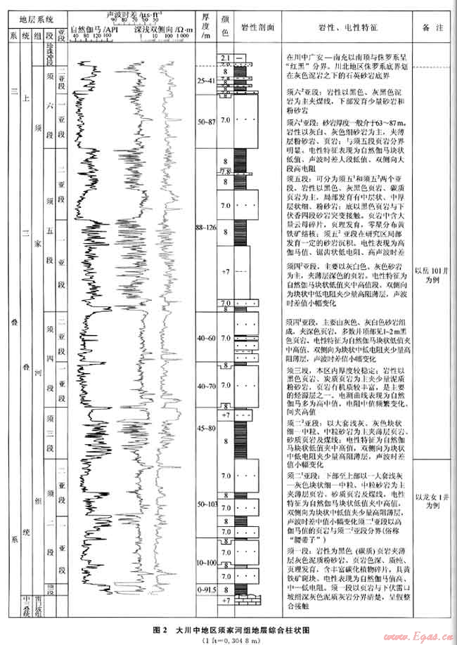 本文所指的四川盆地大川中地區(qū)地理位置北至營山-鹽亭一線,西達(dá)威遠(yuǎn)-八角場,南抵大足-威遠(yuǎn),東接華鎣山,面積達(dá)4×104km2(圖1)。該研究區(qū)是近年來四川盆地天然氣勘探開發(fā)的重要區(qū)域之一。大川中地區(qū)上三疊統(tǒng)須家河組地層縱向上可劃分為須一段-須六段6個巖性段,其中須一、須三、須五段巖性以泥頁巖夾煤層為主,須二、須四、須六段則為砂巖夾泥頁巖(煤)。侏羅系底界劃分意見:在川中南部地區(qū)以“紅黑”原則將侏羅系底界劃在紅色泥巖之下出現(xiàn)的砂巖底界;而川北地區(qū)如龍崗、八角場地區(qū)則劃在灰色泥巖之下的石英砂巖底界。其中須二、須四段基本上以其中部的泥巖段(須二段中部泥巖段,現(xiàn)場稱為“腰帶子”)又劃分為2個亞段,須六段也按巖性劃分出2個亞段(圖2)。