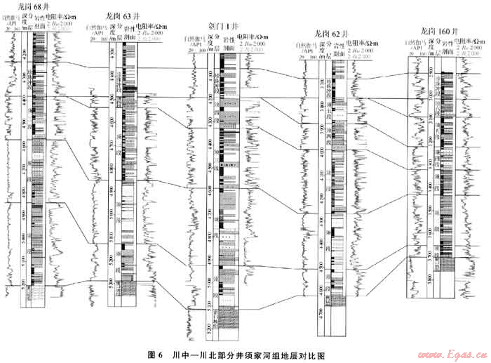 5) 各段沉積期主要的湖岸線位置有差異??傮w上,川中北部地區(qū)須二段沉積期湖岸線大體位于龍崗-元壩一線,東部及東南部以碳酸鹽巖侵蝕凸起為界;須四段(須六段)的湖盆北部岸線大體位于龍崗-八角場一線,東部東南部湖岸線已達(dá)到現(xiàn)今重慶綦江-重慶璧山-四川廣安一帶;須六段沉積期東湖岸線更向東、向南擴(kuò)展。