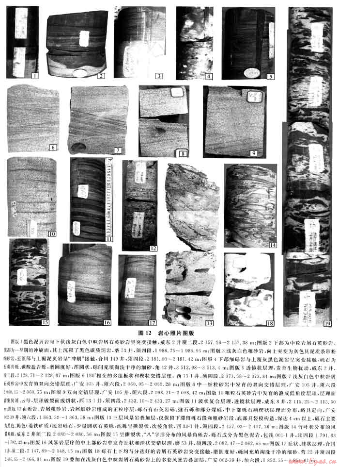 元壩、廣安、南充、合川地區(qū)各段巖心中均見風(fēng)暴巖,重慶代家溝露頭等也見風(fēng)暴巖沉積。據(jù)觀察總結(jié),研究區(qū)風(fēng)暴巖有疊加在濱淺湖砂壩上、分布于淺湖泥及壩后沼澤中3種分布形式。疊加在濱淺湖砂壩上的風(fēng)暴巖反映了較強的風(fēng)暴浪作用,風(fēng)暴巖層底面對下伏淺灰色巖屑石英砂巖強烈沖刷,有的可形成袋模構(gòu)造(圖12-13)。下部的滯積礫石大多數(shù)為撕裂狀或竹葉狀或具塑性變形的泥巖礫、煤礫、碳質(zhì)泥巖礫或粉細(xì)砂巖礫,礫石呈“八”字形排列或雜亂分布(圖12-14~15)。向上砂巖略顯平行層理或出現(xiàn)丘、洼狀交錯層理(圖12-16~17)。由于多次風(fēng)暴作用,往往形成不完整的風(fēng)暴巖疊置層序(圖12-19)。風(fēng)暴巖不會出現(xiàn)在河流環(huán)境,在海洋和湖泊環(huán)境(特別是大湖)是極常見的。