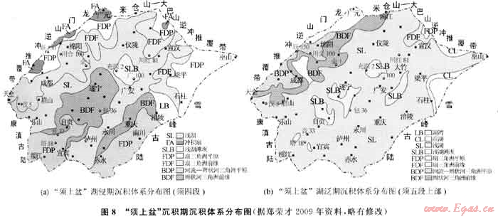 “須上盆”沉積期龍門(mén)山造山帶構(gòu)造活動(dòng)強(qiáng)度逐漸減弱,而米倉(cāng)山-大巴山造山帶構(gòu)造隆升和逆沖推覆作用迅速加強(qiáng),因此,四川類前陸盆地的構(gòu)造-沉積演化和各沉積體系的空間組合和相帶展布,具有早、中期受龍門(mén)山和米倉(cāng)山-大巴山兩造山帶復(fù)合控制,而晚期則主要受米倉(cāng)山-大巴山造山帶控制的特點(diǎn),各沉積體系展布有如下特點(diǎn):