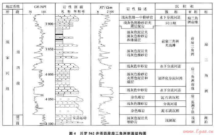 發(fā)育于龍門(mén)山和米倉(cāng)山-大巴山兩造山帶前緣的須四段和須五段,成因與出山口的沖積扇直接入湖有關(guān),屬于近源粗碎屑三角洲,因而無(wú)論是在平面上還是在剖面上,均表現(xiàn)為沖積扇與湖相沉積物交替組合構(gòu)成的進(jìn)積→加積→退積復(fù)合體??蓜澐譃樯热侵奁皆⑸热侵耷熬?、前扇三角洲3個(gè)亞相及眾多微相類型(圖4):