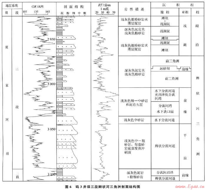 無(wú)論是辮狀河還是曲流河三角洲,都可劃分為三角洲平原、三角洲前緣和前三角洲3個(gè)亞相。以廣為發(fā)育的辮狀河三角洲為例(圖6):