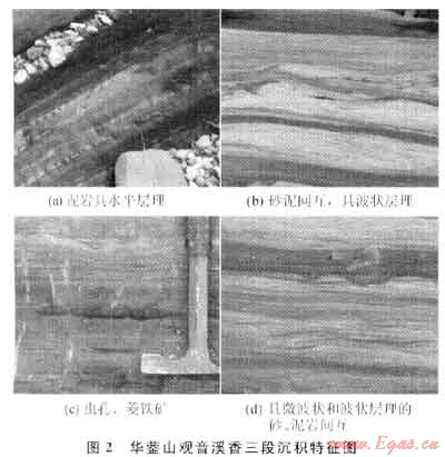上述特征即使在可能鄰近湖泊邊緣的華鎣山觀音溪露頭剖面上也表現(xiàn)得很清楚。該剖面中的巖層被溪水沖刷得非常干凈,沉積特征十分清楚,香三、香五段以灰黑色泥頁巖為主,夾薄層灰色、灰質(zhì)細(xì)-粉粒砂巖。泥頁巖中水平和微波狀層理非常發(fā)育,其中時夾菱鐵礦條帶或菱鐵礦結(jié)核薄層,上部局部含豐富炭質(zhì)甚至成煤線;粉砂巖具有發(fā)育的波狀層理和豐富的蟲孔,普遍含灰質(zhì),局部成泥灰?guī)r團塊或條帶,也夾有菱鐵礦條帶或串珠狀結(jié)核薄層(圖2)。
