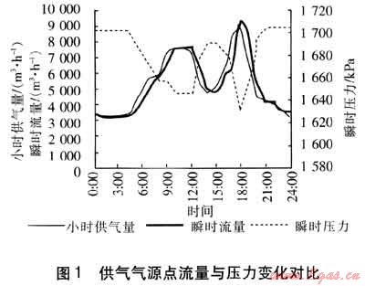 不同的城市在不同的階段會(huì)有不同的供氣方式,不同的供氣方式對(duì)小時(shí)調(diào)峰的敏感程度也有所不同。對(duì)于以CNG作為供氣氣源的城市,受供氣規(guī)模的限制,小時(shí)調(diào)峰問題比較明顯。我公司在管輸供氣之前由兩座CNG儲(chǔ)配站聯(lián)網(wǎng)向市區(qū)供氣,其中秀洲站為主供氣站,南湖站為輔助供氣站,主要在用氣高峰及秀洲站設(shè)備檢休時(shí)向管網(wǎng)供氣。從運(yùn)行情況來看,每天用氣高峰出現(xiàn)在晚上17時(shí)到19時(shí),用氣次高峰在上午10時(shí)到12時(shí)。秀洲站某一天的24h原始運(yùn)行數(shù)據(jù)見表1,表1中出站壓力、瞬時(shí)流量和累計(jì)供氣量均為CNG站調(diào)壓橇內(nèi)壓力表和流量計(jì)的讀數(shù),小時(shí)供氣量為從一個(gè)計(jì)算小時(shí)開始到下一個(gè)計(jì)算小時(shí)開始兩個(gè)時(shí)刻累計(jì)供氣量的差。從表1來看,由于受CNG供氣方式的影響,表1中CNG小時(shí)供氣量、瞬時(shí)流量和出站壓力之間沒有相關(guān)性,表1中數(shù)據(jù)不能反映用氣高峰的情況,但從沒有供氣情況下出站壓力的下降還是能看出管網(wǎng)儲(chǔ)氣用于給用戶供氣的調(diào)峰作用。