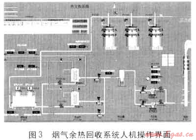 導(dǎo)熱油循環(huán)泵采用軟啟器啟動(dòng),手動(dòng)/自動(dòng)切換及導(dǎo)熱油循環(huán)泵切換均由上位機(jī)控制,當(dāng)發(fā)生故障時(shí)有故障報(bào)警燈報(bào)警。變頻高溫引風(fēng)機(jī)采用變頻/工頻手動(dòng)切換、手動(dòng)/自動(dòng)切換控制、故障報(bào)警。電加熱煅燒爐電動(dòng)煙氣閘板由上位機(jī)控制,現(xiàn)場(chǎng)設(shè)開閉控制器。煙氣余熱回收系統(tǒng)人機(jī)操作界面見(jiàn)圖3,煙氣余熱回收系統(tǒng)中所有溫度、壓力、流量、液位顯示及故障報(bào)警均在上位機(jī)人機(jī)操作界面中顯示。