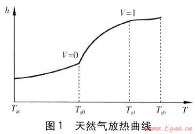 天然氣液化放熱的溫度-比焓(即T-h)曲線由3段平滑曲線組成,分割放熱曲線的點的相應(yīng)溫度是露點Tg1(氣化率V=1)及泡點Tg0(此時氣化率V=0),此2點也是曲線的2個拐點。天然氣放熱曲線見圖1。