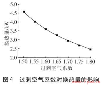 過(guò)剩空氣系數(shù)改變會(huì)影響煙氣進(jìn)口溫度[2],也會(huì)引起煙氣流量變化,使煙氣側(cè)換熱效果發(fā)生變化[3]。保持其他參數(shù)不變,過(guò)??諝庀禂?shù)從1.5增至1.8。根據(jù)燃燒后煙氣總焓不變的原則,計(jì)算出不同過(guò)??諝庀禂?shù)下的煙氣溫度和煙氣流量,代入單管模型進(jìn)行計(jì)算,計(jì)算的換熱量見(jiàn)圖4。過(guò)??諝庀禂?shù)每下降0.1,換熱量可增大20%左右。過(guò)??諝庀禂?shù)增大時(shí),煙氣流量雖然增加,但因燃燒溫度降低使煙氣流速減小,hf減小,使傳熱量減小。故應(yīng)在保證污染物排放不超標(biāo)的前提下,盡量減小過(guò)??諝庀禂?shù)。