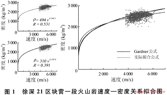 波阻抗等于密度和速度的乘積,而速度與密度存在一定的關(guān)系(如Gardner公式)[9],因此可以通過擬合密度與速度的關(guān)系,將這種關(guān)系代入波阻抗體中,分離出密度來。但不能簡單地套用Gardner公式,因?yàn)镚ardner公式是國外地球物理學(xué)工作者通過對(duì)美國墨西哥灣地區(qū)淺層海相地層中巖心樣品分析得到,它更適合于沉積巖,對(duì)于徐深氣田徐深21區(qū)塊深層火山巖,應(yīng)該根據(jù)實(shí)際情況擬合適用于該區(qū)的公式模型。通過該區(qū)塊營一段火山巖地層的測井資料,得到如下公式模型(圖1):ρ=494v0.1903,相關(guān)系數(shù)為0.531。然后,通過Jason軟件Function模塊編寫函數(shù),將約束稀疏脈沖波阻抗體轉(zhuǎn)換成密度體。