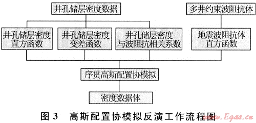 高斯配置協(xié)模擬實(shí)質(zhì)是將地質(zhì)統(tǒng)計(jì)學(xué)理論融入隨機(jī)反演中,隨機(jī)反演在一定地質(zhì)模式指導(dǎo)下進(jìn)行,從而保證反演結(jié)果具有一定的地質(zhì)意義。其具體工作流程(圖3)如下:利用測井密度曲線與波阻抗反演結(jié)果的相關(guān)性,把約束稀疏脈沖波阻抗反演結(jié)果作為隨機(jī)模擬先驗(yàn)信息,使其成為橫向外推的約束條件,把密度曲線作為第一類數(shù)據(jù),波阻抗結(jié)果作為第二類數(shù)據(jù),通過對(duì)常規(guī)波阻抗結(jié)果和密度曲線的直方圖、變差函數(shù)分析,用地質(zhì)統(tǒng)計(jì)學(xué)原理反演出第一類數(shù)據(jù),進(jìn)而得到密度的模擬結(jié)果。