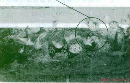 2012年4月,我公司接報坪山某路段有燃氣泄漏。經現場檢測確認泄漏部位后,進行開挖探查。該段為聚乙烯管道,緊鄰路燈,隨橋跨河敷設,埋深約80 crn,且周邊土壤較為潮濕,管道外加鋼質套管保護。開挖后發(fā)現PE管道與鋼質套管的間隙被白蟻蟻巢填滿(見圖l)。經現場清理后發(fā)現該段PE燃氣管道受白蟻蛀蝕大面積破壞,并確認燃氣自白蟻蛀蝕破壞穿孔處泄漏(見圖2)。