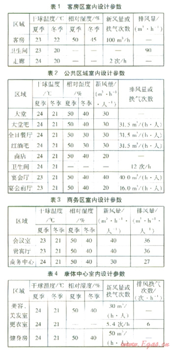 客房區(qū)、公共區(qū)域、商務(wù)區(qū)、康體中心室內(nèi)設(shè)計(jì)參數(shù)分別見表1~4。