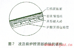 在運(yùn)行過程中,由于高爐煤氣的產(chǎn)量不穩(wěn)定,壓力較低,燃燒器出現(xiàn)數(shù)次熄火。不久,現(xiàn)場(chǎng)運(yùn)行人員在爐膛頂部爐墻發(fā)現(xiàn)幾處裂縫?,F(xiàn)場(chǎng)檢查后發(fā)現(xiàn),爐膛頂部的包墻管為單根光管結(jié)構(gòu),耐火層采用異形耐火磚敷設(shè),絕熱層采用輕質(zhì)保溫磚,最外層用石棉泥抹面密封,改造前爐膛頂部爐墻的結(jié)構(gòu)見圖2。