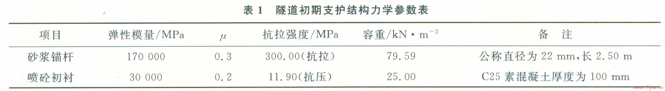 有限元計算參數(shù)彈性模量(Es)為0.8 GPa,泊松比 為0.4,內(nèi)聚力(C)為0.10 MPa,內(nèi)摩擦角為18°,抗拉強度 為0.30 MPa,彈性抗力系數(shù)為80MPa/m,容重 為17.00 kN/m3。隧道初期支護結(jié)構(gòu)力學(xué)參數(shù)如表1所示