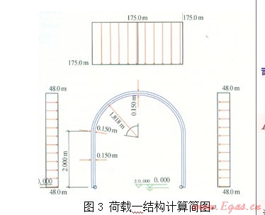 采用結(jié)構(gòu)力學(xué)方法對隧道初期支護結(jié)構(gòu)進行計算,其對應(yīng)的計算模式為荷載結(jié)構(gòu)模式。計算中采用直梁單元對初期支護結(jié)構(gòu)進行模擬,支護結(jié)構(gòu)與圍巖的相互作用通過彈性支承對支護結(jié)構(gòu)施加約束來模擬。由于結(jié)構(gòu)力學(xué)方法不考慮錨桿的作用,計算結(jié)果應(yīng)該偏于安全。荷載一結(jié)構(gòu)計算簡圖如圖3所示。