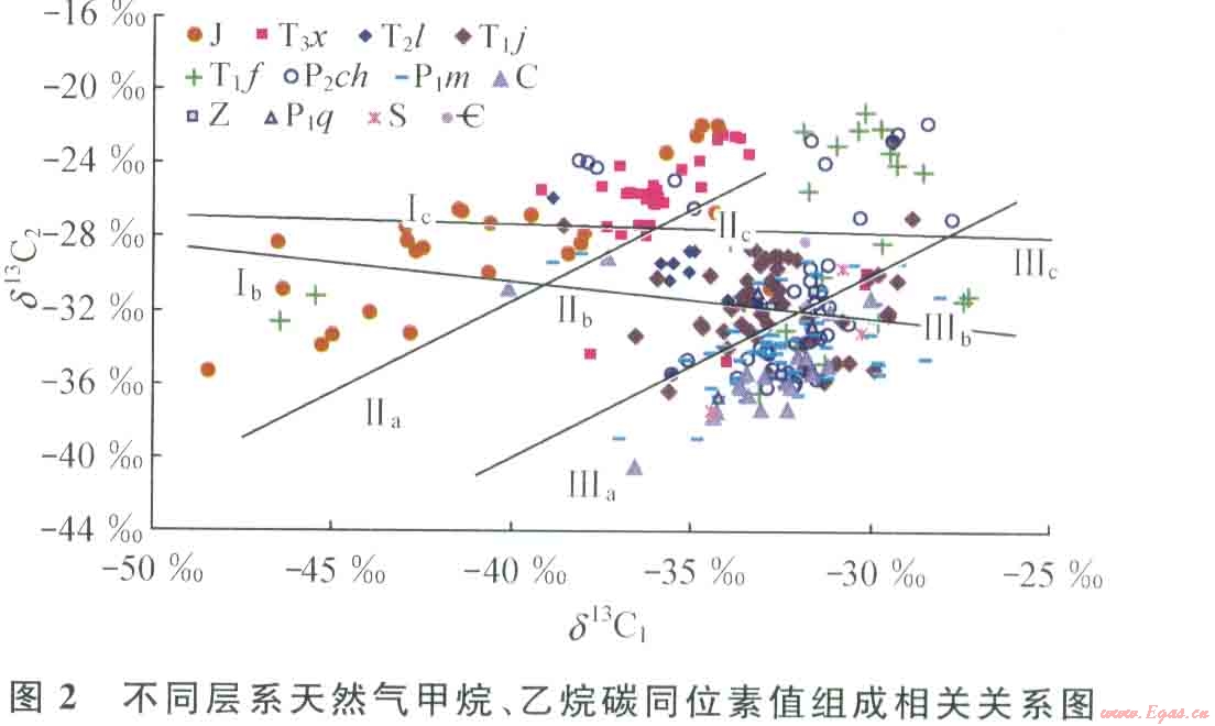圖2不同層系天然氣甲烷、乙烷碳同位素值組成相關關系圖
