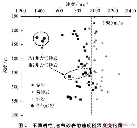 利用波阻抗值來(lái)判別巖性和對(duì)含氣砂巖進(jìn)行判別的一個(gè)重要條件就是不同巖性的速度要具有差異性,因此,本次研究對(duì)盆地內(nèi)兩口氣井(鳳1井和曲2井)茨營(yíng)組三段的巖性和速度特征進(jìn)行分析,其結(jié)果如圖2所示。這兩口井在茨營(yíng)組三段Ⅳ砂組以粉砂巖為主同時(shí)夾有大量泥巖,其整體速度較低,介于1400~2200m/s之間,以1980m/s為界,砂巖和粉砂巖的速度較之泥巖要高,介于1980~2200m/s,而泥巖的速度較低,介于1700~1980m/s,部分粉砂巖和泥巖速度有疊置現(xiàn)象,但整體上仍可以利用速度將砂泥巖區(qū)分開,從圖中可以看出當(dāng)砂巖中如果含氣的話,其速度則明顯降低,但鳳1井和曲2井含氣砂巖的速度降低程度不同,鳳1井的速度降低較大,為1400m/s左右;曲2井速度降低幅度較小,為1800m/s左右。