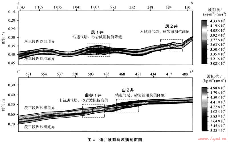 為了對(duì)含氣地層的波阻抗特征進(jìn)行分析,選取7兩條連井剖面(剖面位置見圖1)AB和CD來(lái)進(jìn)行對(duì)比,其波阻抗值特征如圖4所示。其中,AB剖面過鳳1井和鳳2井,鳳1井在目的層段發(fā)現(xiàn)氣層,CD剖面過曲參1井和曲2井,曲2井在目的層段鉆遇氣層,其他兩口井在茨營(yíng)組三段Ⅳ砂組為不含氣砂巖地層。