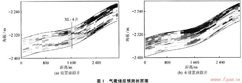 研究結(jié)果表明,根據(jù)地震資料結(jié)合鉆井及地質(zhì)綜合研究構(gòu)建合理“虛擬井”可以有效地解決氣藏邊部井網(wǎng)稀疏區(qū)域井間隨機性強的缺點,能夠進一步提高儲層地質(zhì)模型的精度。將采用和不采用“虛擬井”技術(shù)建立的儲層分布模型進行對比可以看出,其儲層的發(fā)育程度和在空間上出現(xiàn)的位置具有很大的不同(圖1),表明僅依靠地震儲層反演成果約束建立的地質(zhì)模型在邊部井網(wǎng)稀疏的地方不能反映薄儲層在縱橫向上分布的特征。