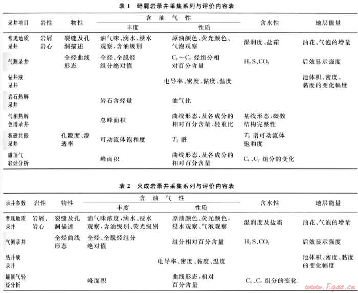 根據(jù)準(zhǔn)噶爾盆地已發(fā)現(xiàn)的碎屑巖和火山巖天然氣藏儲層特性,分別建立了天然氣勘探的錄井采集系列與評價內(nèi)容(表1、2)。