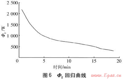 在蓄冷完成后,壓縮機停機,立即開始取冷實驗。由實驗結(jié)果擬合的Φg回歸曲線見圖6。由圖6可知,取冷實驗持續(xù)時間為19min,在5~11min,Φg的變化相對前后兩個時間段要平緩,因此這一時段相變材料處于相變釋冷階段。在19min后,由于相變材料與熱水的溫差較小,因此釋冷緩慢,此時取冷量已經(jīng)達到蓄冷量的90%??紤]到取冷時間較短,以及存在熱損失等因素影響,因此可以基本認定:三套管相變蓄能換熱器在蓄釋能過程中能量是基本守恒的。