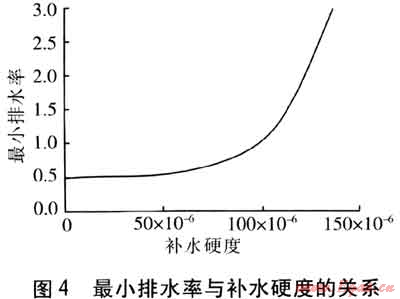 對(duì)蒸發(fā)冷卻系統(tǒng)而言,由于水不斷蒸發(fā),溶于水中的礦物質(zhì)會(huì)析出并沉積在濕簾表面上形成水垢。濕簾表面大量的水垢會(huì)影響濕簾的蒸發(fā)冷卻效率和使用壽命。目前,在燃?xì)廨啓C(jī)進(jìn)氣冷卻系統(tǒng)中,一般針對(duì)不同的補(bǔ)水硬度(以CaC03計(jì),質(zhì)量分?jǐn)?shù))通過(guò)控制排水率(即排水質(zhì)量與蒸發(fā)水質(zhì)量之比)的方法來(lái)抑制水垢的產(chǎn)生。最小排水率通常采用圖4的曲線來(lái)確定[3]。