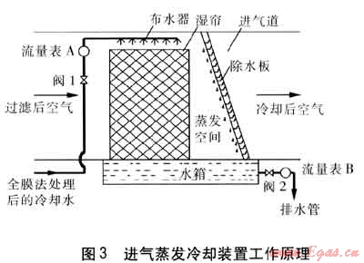 進(jìn)氣蒸發(fā)冷卻裝置工作原理見(jiàn)圖3。它由濕簾、布水器、除水板、水箱及一些附屬設(shè)備組成。其工作原理是:經(jīng)全膜法處理后的冷卻水經(jīng)閥1調(diào)節(jié)送至濕簾頂部的布水器后均勻地灑在濕簾表面,由于重力作用冷卻水自上往下如水簾灑下。空氣首先經(jīng)過(guò)濾器過(guò)濾,除去雜質(zhì),然后再進(jìn)入蒸發(fā)冷卻裝置,與濕簾中自上而下的冷卻水進(jìn)行熱濕交換。部分水因吸收空氣的顯熱汽化蒸發(fā)后變成水蒸氣,未蒸發(fā)的水流回水箱,排出后用于其他用途。空氣因失去顯熱而溫度降低,同時(shí)因融進(jìn)了部分水蒸氣而使其相對(duì)濕度增加??諝馀c水蒸氣的混合物流向下游的除水板,其中的小水滴和部分水霧在除水板上凝結(jié)成大水滴,并在重力的作用下落入水箱,降低了進(jìn)氣的攜水率,減少了壓氣機(jī)因進(jìn)氣空氣水量增加而導(dǎo)致的負(fù)荷消耗;同時(shí)空氣中的微小塵埃也隨水滴落入水箱,淋灑下來(lái)的冷卻水對(duì)空氣還起到了水洗除塵的輔助效果,避免了進(jìn)氣中的微量雜質(zhì)對(duì)燃?xì)廨啓C(jī)葉片的腐蝕。