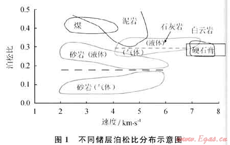 地下介質(zhì)(包括巖層和流體)具有不同泊松比值,國(guó)內(nèi)外學(xué)者在20世紀(jì)70年代對(duì)泊松比與巖性、流體的關(guān)系進(jìn)行了大量研究。漢密爾頓、格里哥里等得到了泊松比與巖石孔隙中流體性質(zhì)關(guān)系的最有價(jià)值的結(jié)果有:①未固結(jié)的淺層鹽水飽和沉積巖往往具有很高的泊松比(大于0.4),這實(shí)際上與泥頁(yè)巖相近;②泊松比往往隨孔隙度的減小及沉積物的固結(jié)而減??;③高孔隙度的鹽水飽和砂巖往往具有較高泊松比(0.3~0.4),這是砂巖含水飽和的情況;④氣飽和高孔隙砂巖往往具有低泊松比,可能低到0.1。這說(shuō)明含氣層泊松比很低,含水層泊松比明顯增高,致密層更高。更多的研究成果還表明[1~3]:泥頁(yè)巖層泊松比高于砂巖層,碳酸鹽巖地層與砂泥巖層相似。碳酸鹽巖和砂泥巖地層中,含氣與含水的泊松比均有一個(gè)分界線,砂巖地層差異更明顯,石灰?guī)r地層差異略小,但都能分辨出氣水??梢杂檬疽鈭D(圖1)說(shuō)明儲(chǔ)層泊松比的普遍規(guī)律。