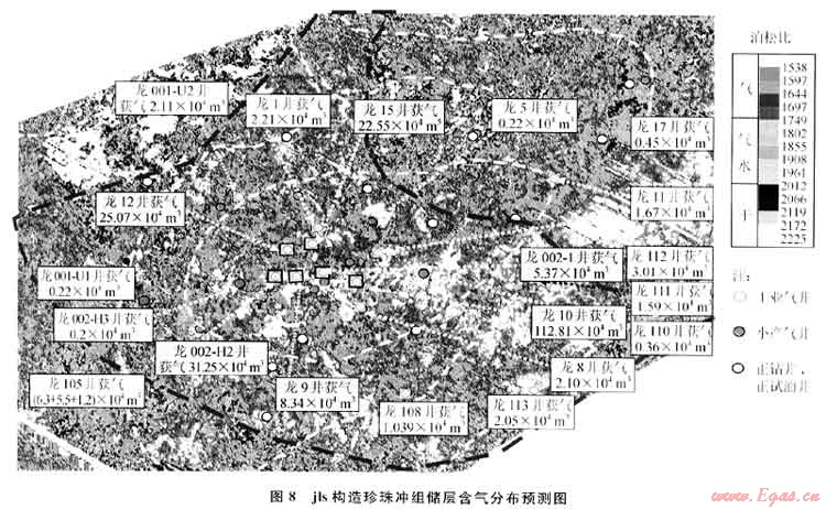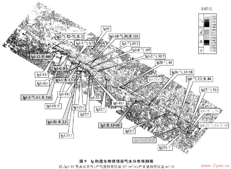 圖9為lg構(gòu)造二疊系生物礁儲(chǔ)層氣水分布預(yù)測(cè)圖。該圖展示,構(gòu)造中部北東南西向有一明顯分界線,西南(左下半部)為臺(tái)地相沉積區(qū),西北部為海槽,中間為臺(tái)緣。預(yù)測(cè)臺(tái)地為含水及差儲(chǔ)層區(qū),中間為臺(tái)緣部位,為預(yù)測(cè)的含氣帶,東北部為海槽,預(yù)測(cè)出大片含氣區(qū)。該構(gòu)造儲(chǔ)層段鉆探大量井位,前期在臺(tái)緣部位取得較好效果,高產(chǎn)井較多(黃色、綠色文字框所示),但后來(lái)鉆遇大量氣水井或水井(綠色或藍(lán)色文字框所示),尤其在臺(tái)地部位部署的井位基本上為干井或水井(白色或藍(lán)色文字框所示),獲氣井很少。氣水預(yù)測(cè)結(jié)果與實(shí)鉆結(jié)果基本吻合。預(yù)測(cè)還表明,該區(qū)海槽部位還有大片含氣區(qū),但該區(qū)僅有l(wèi)g10井鉆達(dá)目的層,且不產(chǎn)氣,雖然該井預(yù)測(cè)與實(shí)鉆吻合,但沒有更多的井來(lái)證實(shí),且該區(qū)儲(chǔ)層情況還存在認(rèn)識(shí)上的爭(zhēng)議,要靠將來(lái)的實(shí)鉆進(jìn)一步驗(yàn)證。