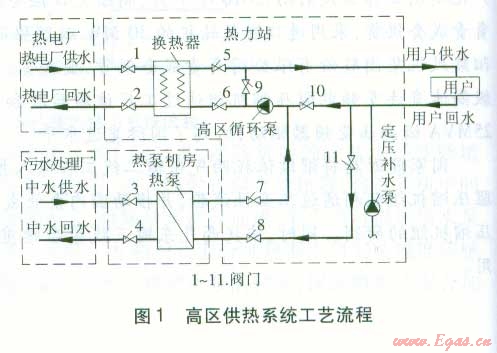 污水處理廠內(nèi)建有中水泵站l座,安裝3臺(tái)流量為625 m3h、揚(yáng)程為40 m的循環(huán)泵,流量滿足熱泵需求,中水循環(huán)泵采用變頻調(diào)速(由供回水壓差控制)。將中水作為熱泵的低溫?zé)嵩?,在小區(qū)內(nèi)建造熱泵機(jī)房1座。將熱泵作為基本熱源,承擔(dān)設(shè)計(jì)負(fù)荷的75%左右。熱電廠作為峰荷熱源,并在嚴(yán)寒期單獨(dú)運(yùn)行。小區(qū)內(nèi)建熱力站4座,由于l8層建筑比較分散,因此在1~3號(hào)熱力站內(nèi)分別設(shè)置l套高區(qū)系統(tǒng)和l套低區(qū)系統(tǒng),4號(hào)熱力站只設(shè)置l套低區(qū)系統(tǒng)。高區(qū)、低區(qū)供熱系統(tǒng)的工藝流程分別見(jiàn)圖1、2。