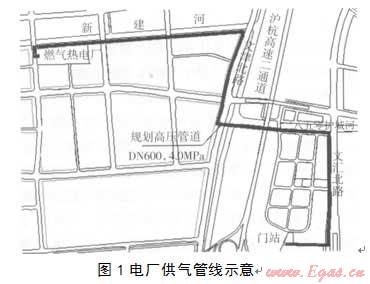 由于城市門站直線距離電廠不足3kin,管線距離僅4.5km,為此電廠所需天然氣從市門站接出,并用專線直供電廠??紤]到電廠二期擴建及減少啟停和事故狀態(tài)下對天然氣管網(wǎng)的沖擊,管徑選擇為DN600。但是目前的城市門站只能滿足電廠一期工程的需要,為此一期供氣工程利用現(xiàn)狀高壓系統(tǒng),在現(xiàn)狀進站總管設(shè)置三通后,經(jīng)計量(成撬設(shè)置)后直供電廠。同