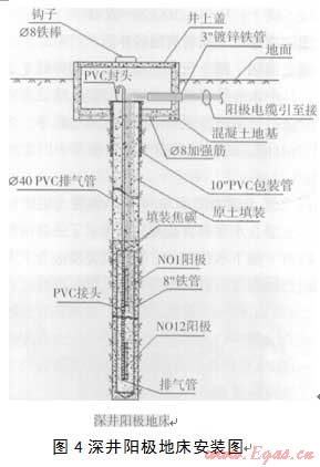 公司于2011年3月苗‘先啟動了Ⅸ域二的深井陽極電流保護工程。經(jīng)計算管道保護面積為19 631m2,設計保護電流密度為lomA/m2,保護總電流為196A,在南浦氣化站和位于車站大道的公用集團內各設置1座深井陽極陰極保護站。每個站內設l00A/100V恒電位儀2臺,-開-備。在站內距離管線50m~100m的低洼潮濕、土層較厚處鉆建直立式陽極地床,升深60m,井內裝分段預制型陽極體7組,規(guī)格為Ф325×6 000,內裝Ф75×1 500高硅鑄鐵陽極3支。將高硅鑄鐵陽極、高性能碳素填料,PVC排氣管,部分陽極引線電纜,井套管組合裝配為-體,便于運輸和安裝,并可保證裝配精度和質量(圖4)。每500m左有設置-個測試樁或在原有閥門井內設置測試點。對于平行或跨越管道按-定間距或在最接近處作均壓處理,使電位分布均衡。