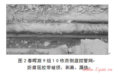 開挖時還發(fā)現(xiàn)原犧牲陽極施工安裝數(shù)量嚴重不足、安裝不規(guī)范、庭院管道基本無保護等問題,導致-旦防腐層損傷,鋼管加速腐蝕。在凝水缸、閥門、三通、彎頭等不規(guī)則形狀部位防腐質量不好,存在嚴重漏點,陰極保護電流損失很大,有限的犧牲陽極過早就消耗失效。