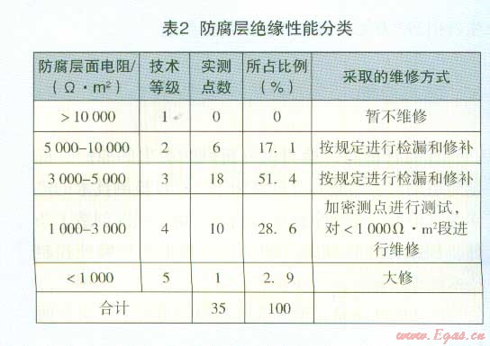 35個測點的防腐層電阻率從826Ω·m2~8 218Ω·m2,管道的外防腐層電阻率犬部分在3 000Ω·m2~5 000Ω·m2,平均值為3 996Ω·m2,說明管道防腐層等級基本上為“差”。
