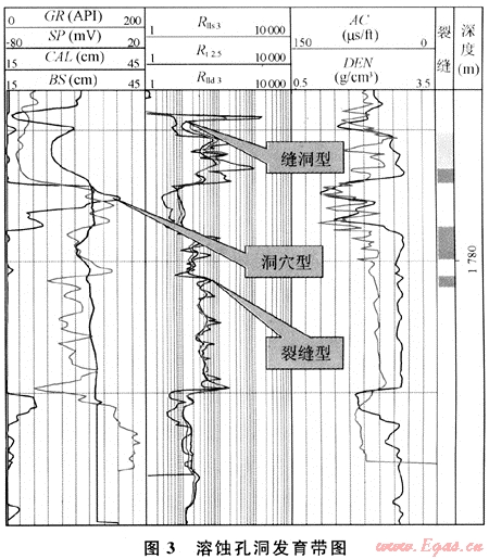 小型溶洞及溶孔在測井曲線上特征不太明顯,只在溶蝕孔洞發(fā)育段表現(xiàn)為深淺側(cè)向電阻率曲線顯示較低的電阻率值,且出現(xiàn)正幅度差,即深側(cè)向電阻率值大于淺側(cè)向電阻率值,自然伽馬比純石巖段略高;聲波時(shí)差和中子測井值增大,密度測井值降低,并有擴(kuò)徑現(xiàn)象。在巖心和薄片上較易觀察。也可以用微電阻率成像測井(FMI)來進(jìn)行觀察。