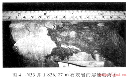 碳酸鹽巖是一種化學(xué)性較活潑的巖石,具有可溶蝕性,而且基本上貫穿其成巖作用的各個(gè)階段,只是溶蝕強(qiáng)度有明顯差異。該成巖作用常常導(dǎo)致孔、洞的大量發(fā)育,對改善儲(chǔ)層的儲(chǔ)集性能具有非常積極的意義。如南33井1826.27m奧陶系下馬家溝組巖心表面見有方解石充填物的溶蝕孔洞,洞徑約3×6mm,肉紅色石灰?guī)r邊緣還見溶蝕形成的港灣狀(見圖4)。