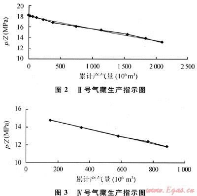 Ⅱ號(hào)氣藏是澀北一號(hào)氣田的一個(gè)中型氣藏,Q1+2地層,含氣面積21km2,井段跨度43m,氣層數(shù)2個(gè),地質(zhì)儲(chǔ)量40.2×108m3,氣藏海拔埋深1610~1550m,原始地層壓力13.6MPa;Ⅳ號(hào)氣藏處于Ⅱ號(hào)氣藏下部,由11個(gè)氣層組成,含氣面積43.4km2,地質(zhì)儲(chǔ)量110.6×108m3,氣藏海拔埋深1530~1440m,井段跨度78m。由于是同沉積背斜構(gòu)造,兩個(gè)氣藏構(gòu)造相似,變化幅度一致。由于澀北氣田共有60余個(gè)氣層,10余個(gè)氣藏,選取的兩個(gè)氣藏一個(gè)是2層,一個(gè)是多層,故具有一定代表性,分別代表了精細(xì)劃分開發(fā)層系與粗略籠統(tǒng)劃分開發(fā)層系的兩個(gè)氣藏單元,動(dòng)態(tài)儲(chǔ)量計(jì)算采用傳統(tǒng)的物質(zhì)平衡壓降法和壓力產(chǎn)量遞減法兩種方法。