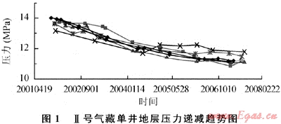 按照同樣的方法,可以計(jì)算Ⅱ氣藏的動(dòng)態(tài)儲(chǔ)量約為40.8×108m3,計(jì)算結(jié)果與用壓降法計(jì)算的動(dòng)態(tài)儲(chǔ)量相吻合。