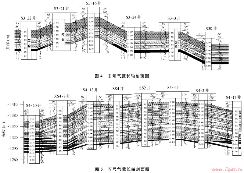 由于Ⅱ號(hào)和Ⅳ號(hào)氣藏都是多層疏松砂巖,繪制氣藏長(zhǎng)軸剖面圖如圖4、5所示。