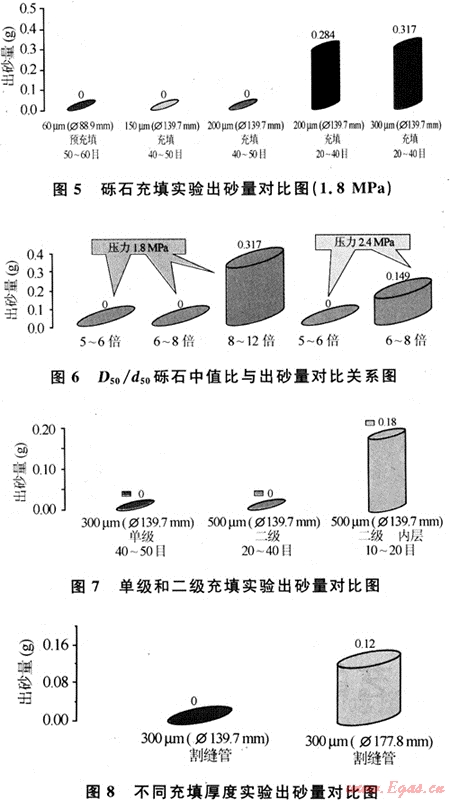 從試驗(yàn)結(jié)果可以看出:①相同生產(chǎn)壓差下,充填礫石尺寸越大越容易出砂;對(duì)于相同尺寸的礫石,降低生產(chǎn)壓差可以減少出砂甚至不出砂;在兩種壓差下,D50/d50比值為5~6倍時(shí),出砂量為零,提高壓差,在不出砂的條件下單位采氣指數(shù)略有增高。②對(duì)礫石充填防砂,防砂效果與充填厚度有關(guān),厚度太小或?qū)е路郎笆。瑐鹘y(tǒng)理論認(rèn)為充填厚度應(yīng)大于20mm,盡可能保證充填厚度大于30mm;兩級(jí)充填時(shí)的防砂效果主要決定于外層礫石,采用多級(jí)防砂時(shí),若要防止砂產(chǎn)出,應(yīng)盡可能增加外層礫石的充填厚度。