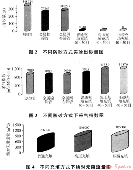 針對(duì)澀北氣田的地層特性,進(jìn)行了14組試驗(yàn),包括割縫管防砂、金屬網(wǎng)優(yōu)質(zhì)篩管防砂、金屬棉優(yōu)質(zhì)篩管防砂、普通礫石充填防砂、高壓充填及壓裂充填條件下的出砂模擬試驗(yàn),評(píng)價(jià)其防砂效果及對(duì)產(chǎn)能的影響規(guī)律,確定適合澀北氣田的防砂方式,試驗(yàn)結(jié)果見(jiàn)圖2~4。