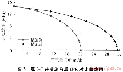 澀3-7井在2002年10月12日實(shí)施高壓一次充填作業(yè),并且分別在防砂前2002年8月1日和防砂后2002年11月1日進(jìn)行了產(chǎn)能試井,對(duì)試井資料使用一般單點(diǎn)法、指數(shù)式單點(diǎn)法和二次單點(diǎn)法進(jìn)行分析處理,得出措施前后的IPR對(duì)比曲線(圖3)。