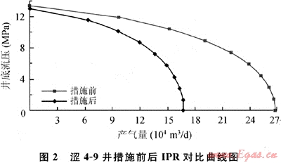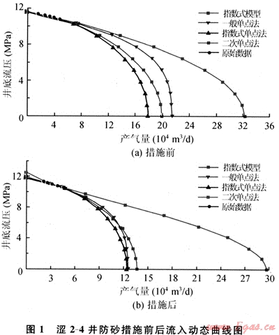 澀4-9井在2003年9月28日實(shí)施高壓一次充填作業(yè),并且分別在防砂前20Q3年8月12日和防砂后2003年11月24日進(jìn)行了產(chǎn)能試井,對(duì)試井資料使用一般單點(diǎn)法、指數(shù)式單點(diǎn)法和二次單點(diǎn)法進(jìn)行分析處理,得出措施前后的IPR對(duì)比曲線如圖2所示。