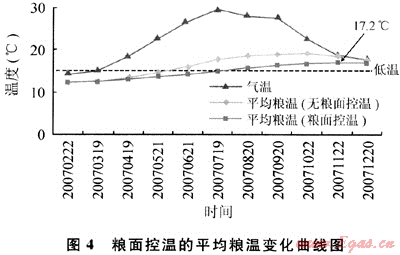 利用污氮采用如圖3所示的工藝流程進(jìn)行糧面控溫,在糧倉上部空間充入污氮,然后進(jìn)行噴霧增濕降溫,將倉溫控制在20℃以下。通過糧面控溫,平均糧溫的變化曲線如圖4所示。從圖可知,從8月份開始,平均糧溫超過15℃,全年的最高糧溫出現(xiàn)在11月份,達(dá)到17.2℃。由此可見,全年采用糧面控溫時,只有4個月左右的平均糧溫超過15℃,其余均控制在15℃以下,平均糧溫低于常規(guī)的無糧面控溫的糧溫。