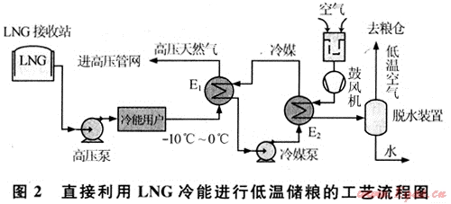 直接利用LNG的冷能來替代谷冷機(jī)生產(chǎn)冷空氣,工藝流程如圖2所示。LNG從接收站的大罐中抽出,然后經(jīng)高壓泵增壓至7.0~8.0MPa。按照“溫度對口,梯級利用”的原則,先經(jīng)保溫管線將LNG用于冷能用戶,溫度升高到0℃左右的天然氣用于低溫儲糧。在糧庫內(nèi)冷媒經(jīng)換熱器E1與天然氣換熱,天然氣溫度超過5℃后進(jìn)入高壓天然氣管網(wǎng);冷媒從10℃左右降溫到5℃左右,通過冷媒泵輸送到換熱器E2中和增壓的空氣換熱,冷媒釋放出冷能后通過管線輸送回E1,空氣吸收冷媒的冷能后溫度降低,低于10℃后,經(jīng)過脫水裝置從塔底將水分離后獲得濕度適當(dāng)?shù)牡蜏乜諝?,然后通入糧倉中用于糧食的通風(fēng)降溫,實現(xiàn)低溫儲糧。