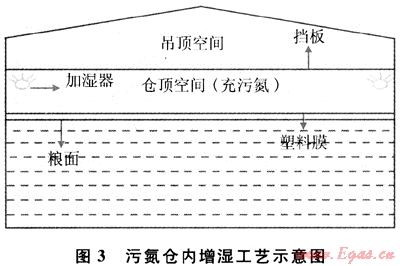 目前,我國福建、廣東、上海、河北和江蘇等地的LNG接收站均規(guī)劃建設(shè)利用LNG冷能的空分裝置,其規(guī)模均在日產(chǎn)液體空分產(chǎn)品600t左右,空氣分離過程同時副產(chǎn)了大量的污氮。從空分裝置排出的污氮含氧量在5%以下,溫度為5~10℃,幾乎不含水。假定污氮溫度為10℃,熱容為1.035kJ/(kg℃),則100t/d的污氮從10℃升高至20℃時提供的顯冷約為12.0kW。同時污氮絕對干燥,通過加水增濕可將低濕度轉(zhuǎn)化為冷量,10℃絕對干燥的污氮?dú)怏w的焓值為10.1kJ/kg,當(dāng)污氮變成20℃、相對濕度80%時的焓值為50.24kJ/kg,則100t/d的污氮可提供冷能約46.5kW。因此,10℃、100t/d的污氮可以提供58.5kw的冷能,其中顯冷僅占20.5%,而干度轉(zhuǎn)化成的冷能占79.5%。污氮用于低溫儲糧主要有兩種方式:①將污氮進(jìn)行霧化增濕,溫度降低,低于10℃后通入糧倉進(jìn)行穿透降溫,替代谷冷機(jī);②根據(jù)倉儲經(jīng)驗,大約有70%的熱量是通過倉房頂部傳入庫內(nèi)的,所以可將污氮充入密閉的糧倉上層空間,然后在倉內(nèi)進(jìn)行霧化增濕降低污氮溫度,使倉溫保持在20℃以下,抵消掉從倉房頂部傳入的熱量,減緩平均糧溫的升高速度。其工藝流程如圖3所示。