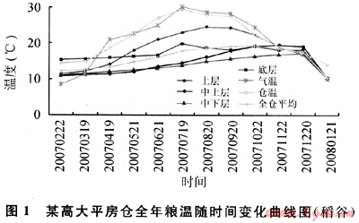 南方地區(qū)某高大平房倉(稻谷)冬季采用強(qiáng)制通風(fēng)降溫后全年的氣溫、倉溫和全倉糧溫變化曲線如圖1所示。