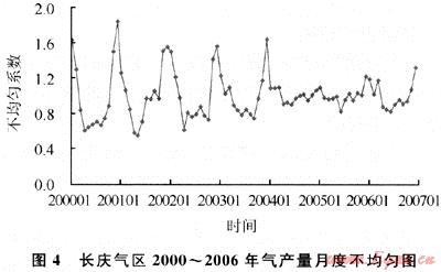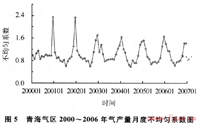 近幾年由于受?chē)?guó)家經(jīng)濟(jì)宏觀調(diào)控政策和城市環(huán)保要求提高等因素的影響,民用、發(fā)電等用氣增長(zhǎng)較快,但民用和采暖用氣的季節(jié)性不均勻問(wèn)題突出,冬季高月和夏季低月值相差很大。中國(guó)石油每年的1、2、3、10、11、12等6個(gè)月的不均勻系數(shù)偏大(不均勻系數(shù)為月產(chǎn)量與年均月產(chǎn)量的比值),最高為12月份,連續(xù)6a的12月不均勻系數(shù)都在1.2以上,2005年不均勻系數(shù)達(dá)到了1.54的高峰,峰谷差為1.3~1.5倍(圖3)[4~5]。