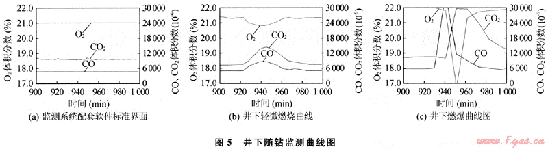 井下隨鉆監(jiān)測(cè)系統(tǒng)是專(zhuān)門(mén)為監(jiān)測(cè)井下燃爆現(xiàn)象而開(kāi)發(fā)研制的。目前,在現(xiàn)場(chǎng)使用比較成熟的是西南石油大學(xué)研制的UBD氣體監(jiān)測(cè)系統(tǒng),其主要原理是在監(jiān)測(cè)到烴類(lèi)氣體的情況下,通過(guò)對(duì)返出氣體中O2、CO2、和CO體積分?jǐn)?shù)變化的監(jiān)測(cè)來(lái)判斷井下是否發(fā)生燃爆。一旦發(fā)生井下燃爆,由于井下燃燒為不完全燃燒,返出氣體中的CO2、CO氣體體積分?jǐn)?shù)會(huì)升高,而O2氣體體積分?jǐn)?shù)會(huì)降低。圖5是3種情況下監(jiān)測(cè)界面圖的對(duì)比[2]。